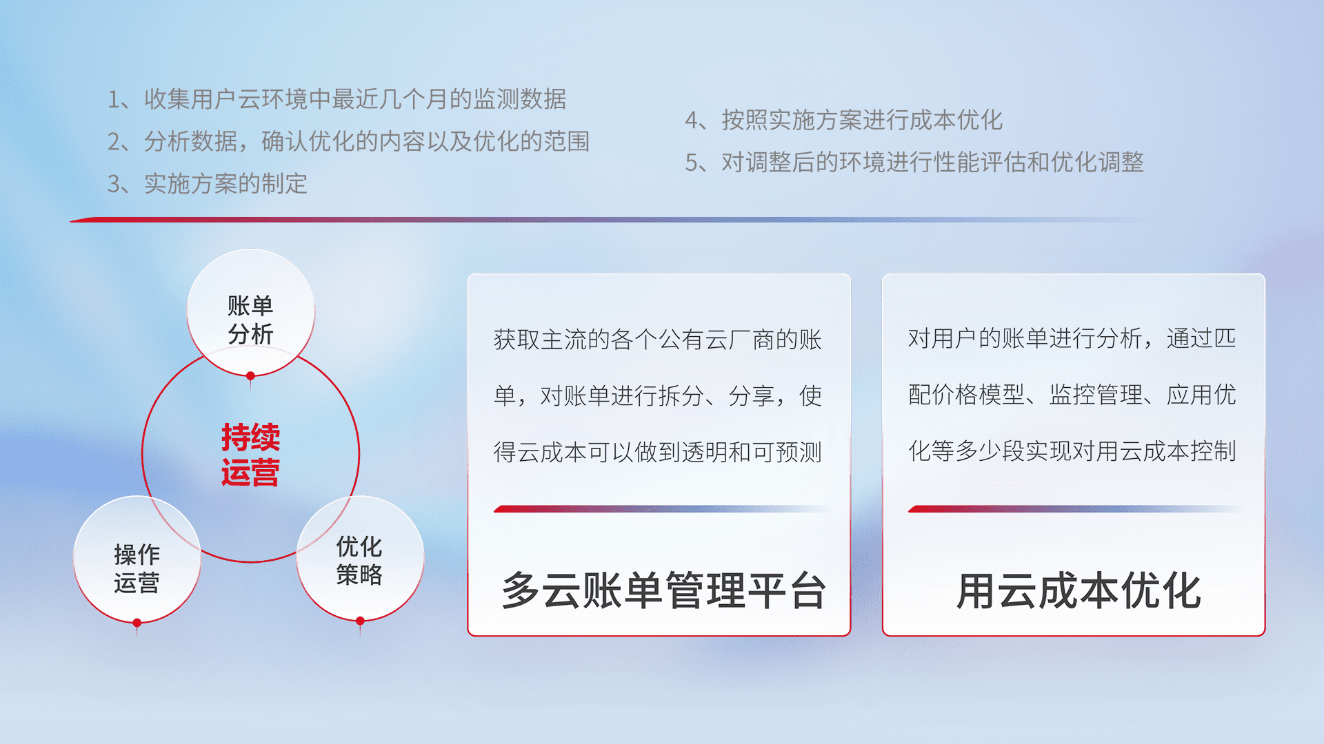 通过多云纳管,,以统一的资源数据模型把客户的云资源进行抽象和封装,,,进而实现对多云资源的统一操作,,保障云资源管理的可靠性、、稳定性与可用性。。量身定制化运维内容,,配置、、、、开发运维、、补丁管理、、备份、、监控、、认证和访问管理、、、审计和日常巡检等,,保障在用云过程中的可靠度,,,稳定度以及高可用率。。。。
